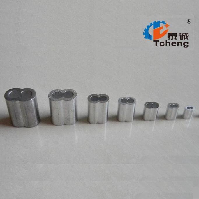 鋼絲繩鋁套—鋁套是鋁材質(zhì)的,較輕,用來固定鋼絲繩兩端的頭的,鋼絲繩根據(jù)需要的掛圈大小,插入鋁套,然后放入壓套機模具內(nèi),(根據(jù)鋁套型號對應(yīng)壓套機模具,模具型號跟鋁套型號都是標(biāo)準(zhǔn)尺寸),壓制完,把兩邊擠壓出來的鋁廢料清理掉,一根鋼絲繩完成!